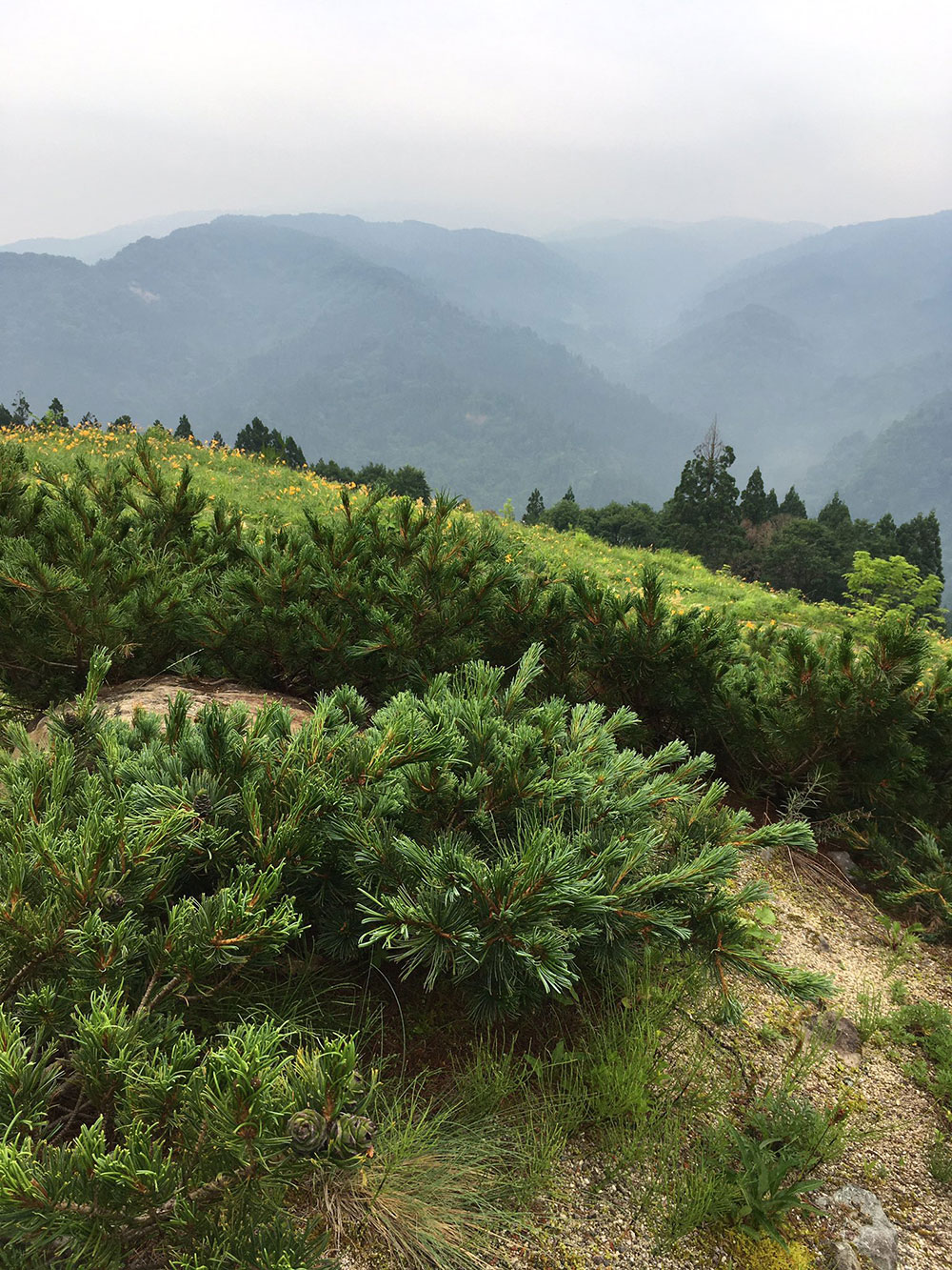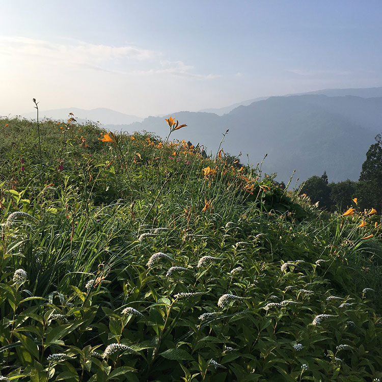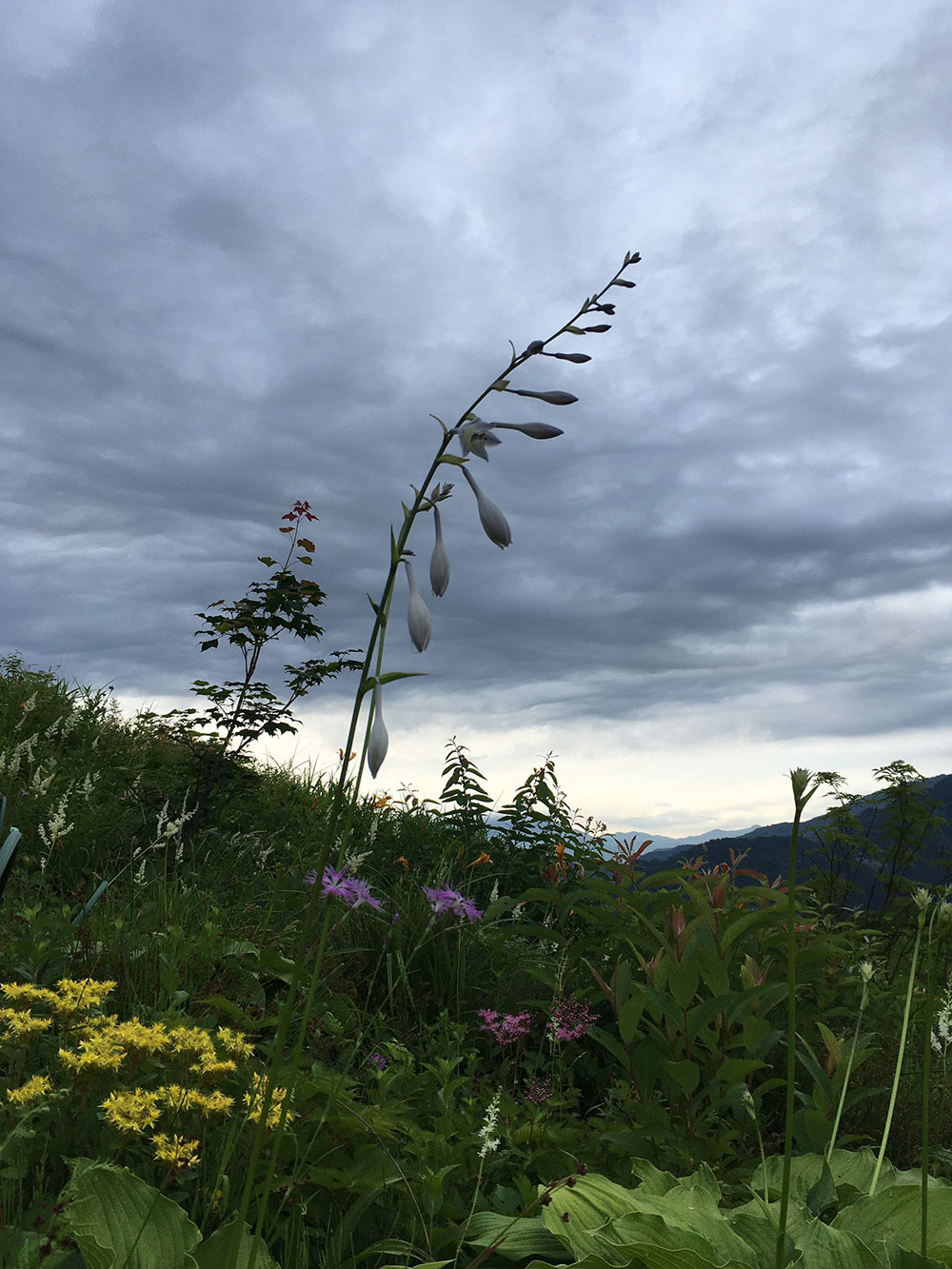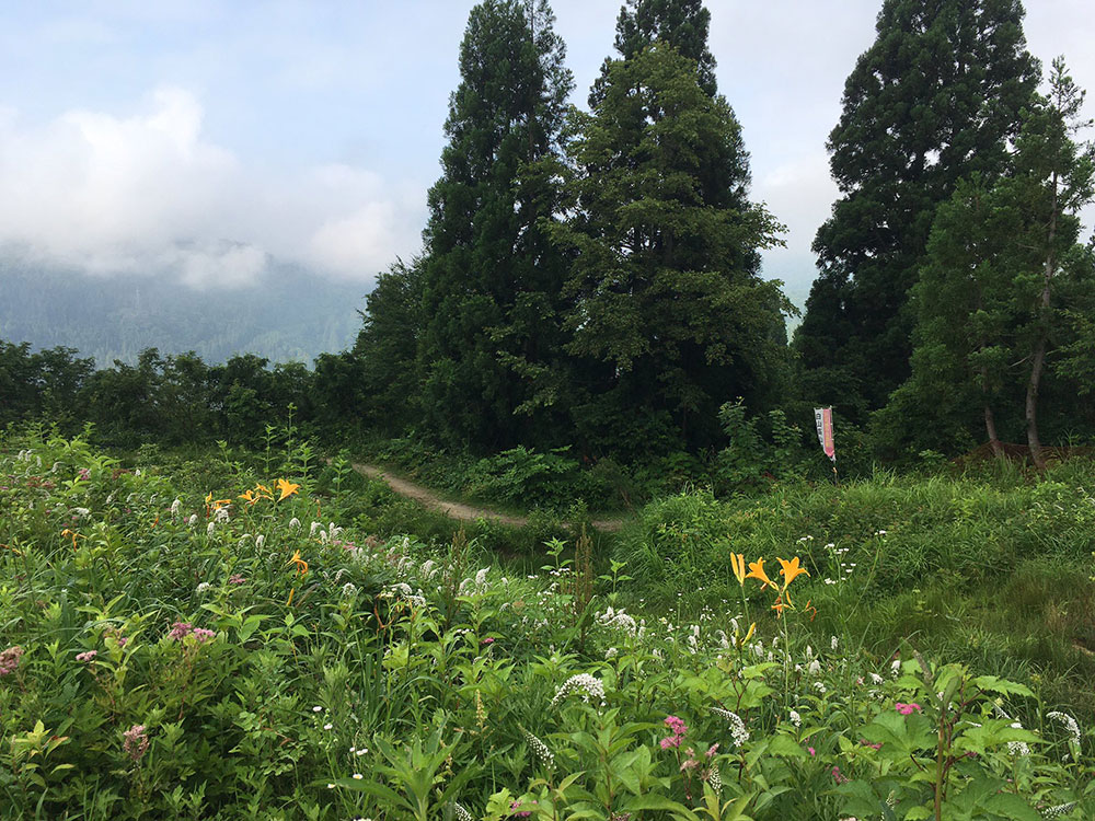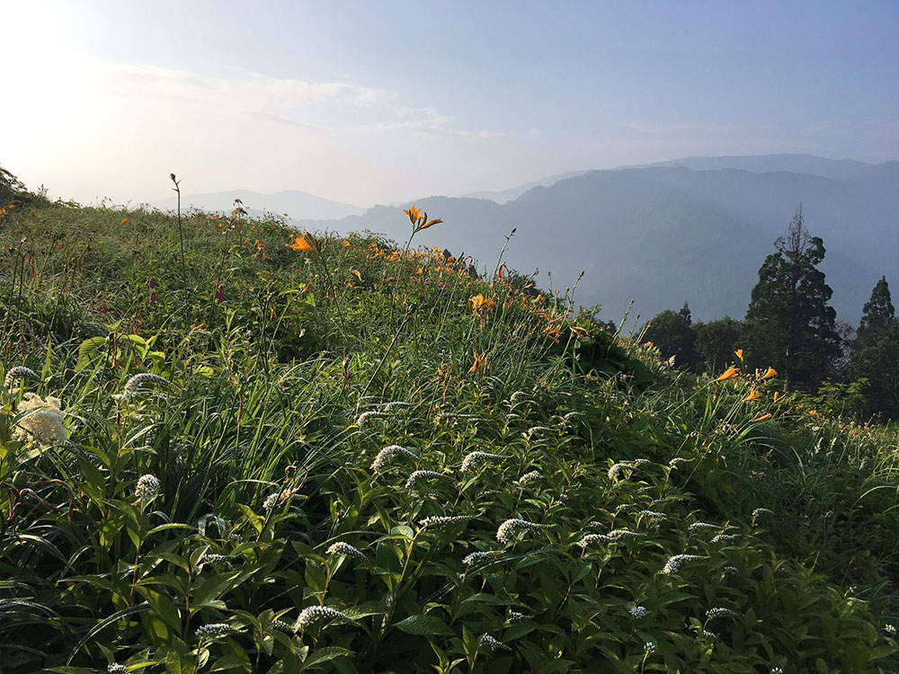 今朝は薄曇りながら白山はくっきりと見えています。ニッコウキスゲは四分咲きくらいに。