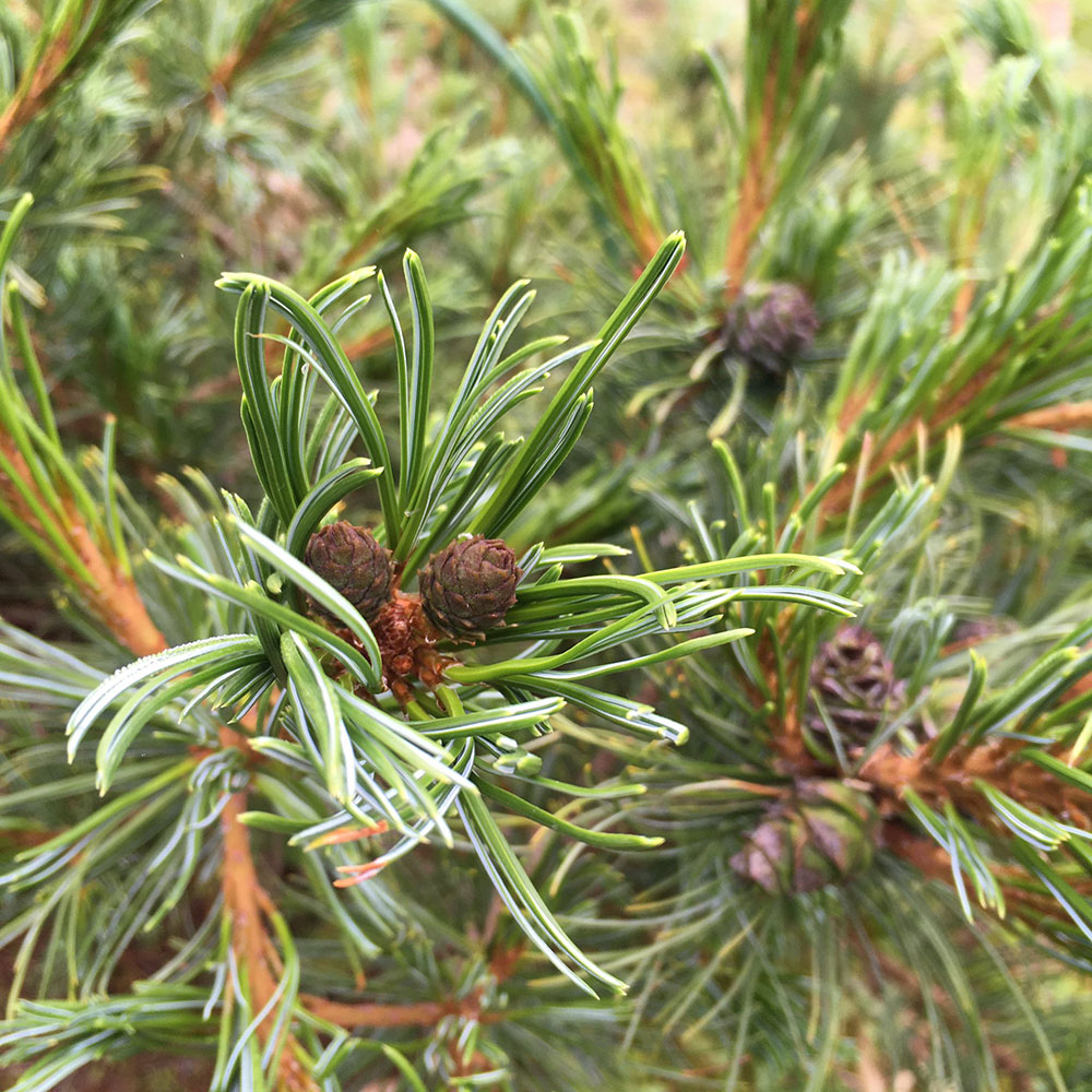ハイマツは、枝先に今年の若い球果、一段下には昨年の球果。一年以上かかって熟します。