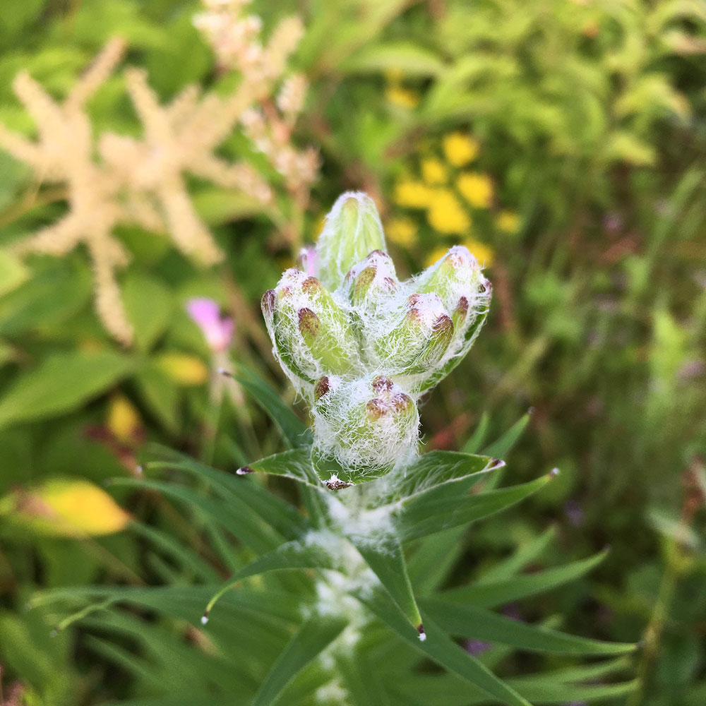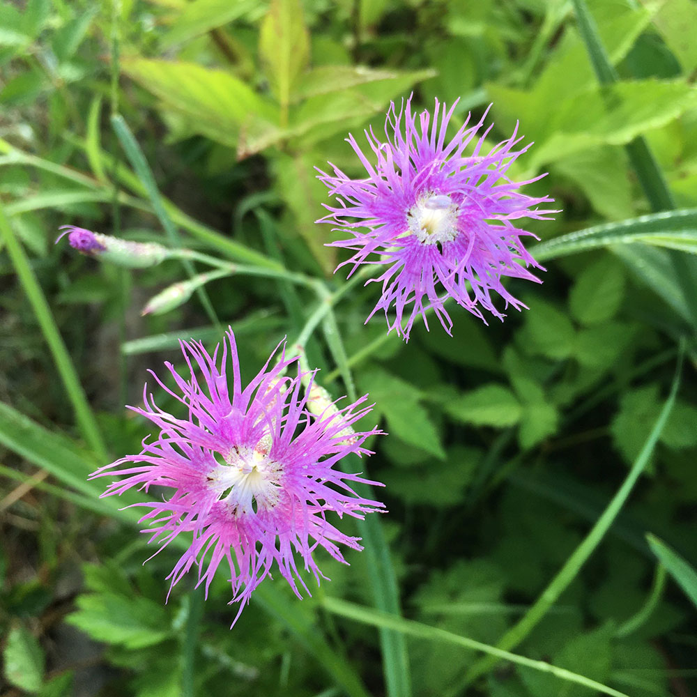 花弁の先が細裂するタカネナデシコは咲き始め。塔のようなクガイソウも、花序の最下の花から開き始めました。