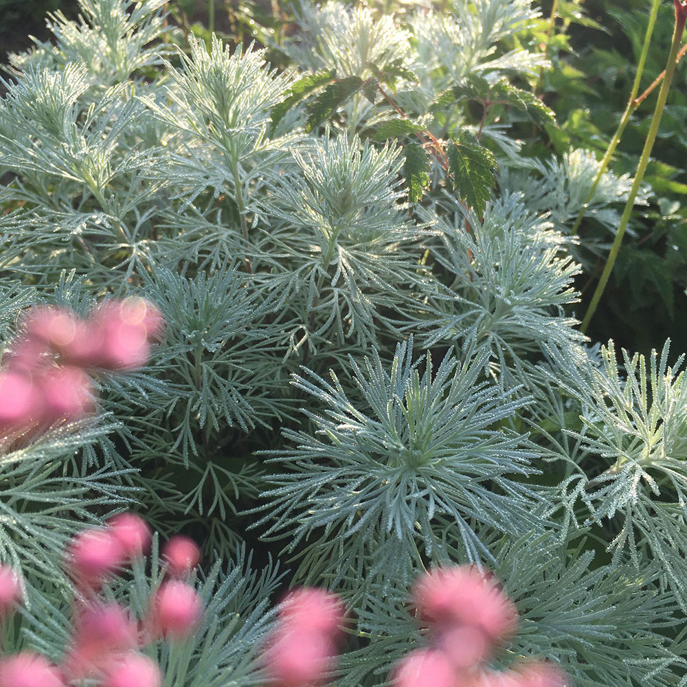白いモフモフはアサギリソウ。渓谷の断崖上に自生するヨモギ類。