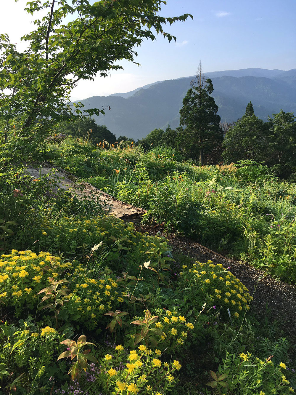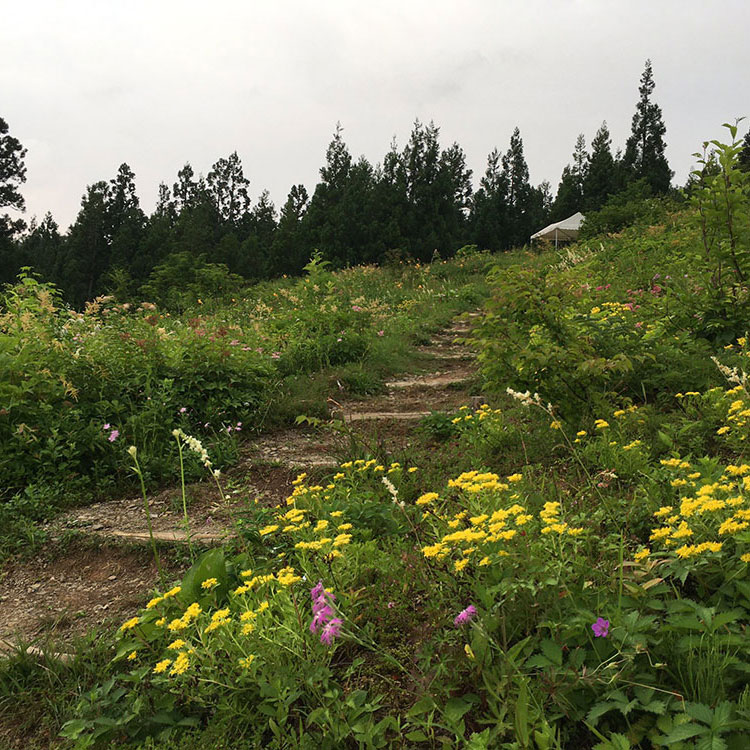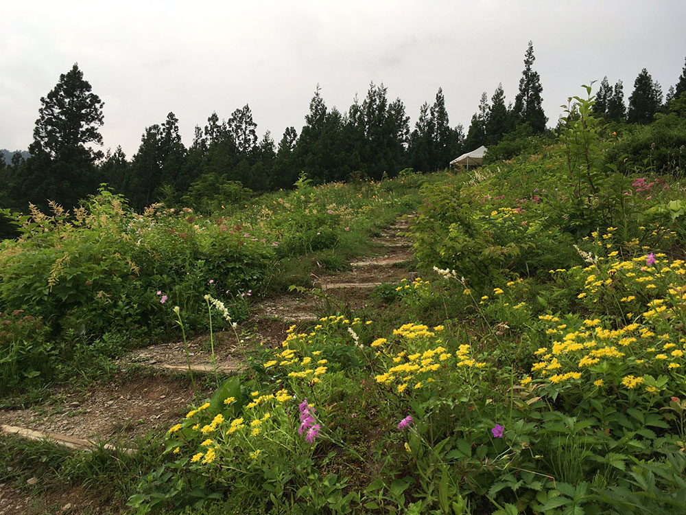 今日も猛暑の予報、暑さ対策は万全に。お花畑入り口の黄色のじゅうたんは、ニッコウキスゲよりずっと小さなハナニガナ。低地から高山まである多型的な種類で、付近に自生しています。