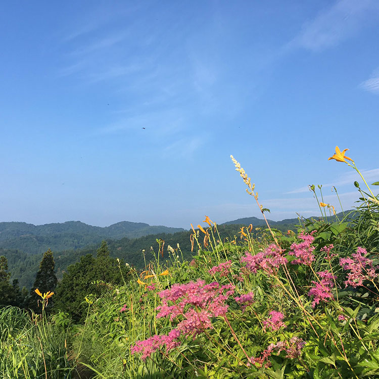 今日は梅雨の合間の青空がひろがり、残雪の白山もきれいに見えています。お客さんの数も多くにぎやか。