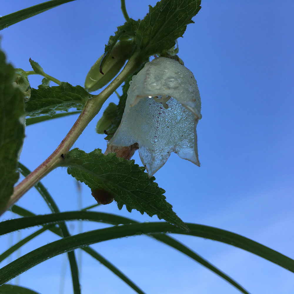 昨日の激しい雨が染み込んで、ホタルブクロがガラスの傘に。