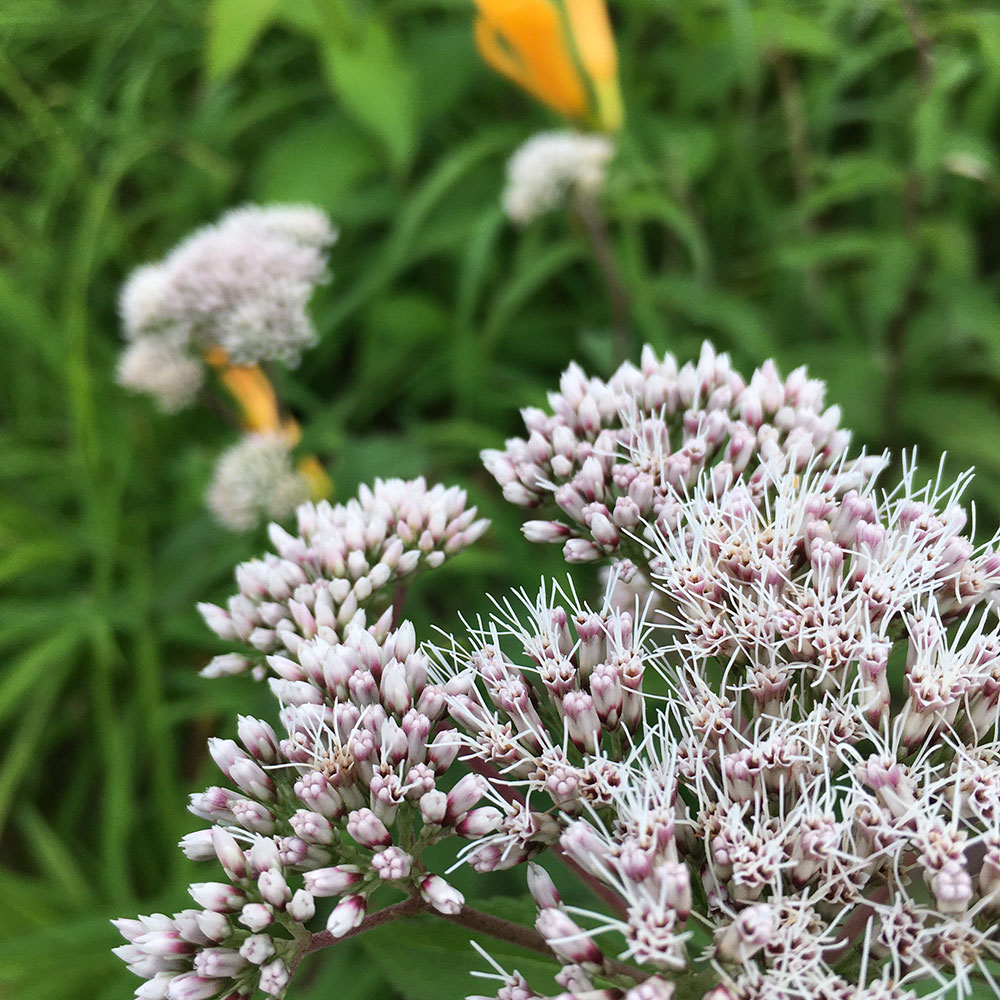 薄いピンクはヨツバヒヨドリ。5個の花がかたまって1個の花のように見えます。