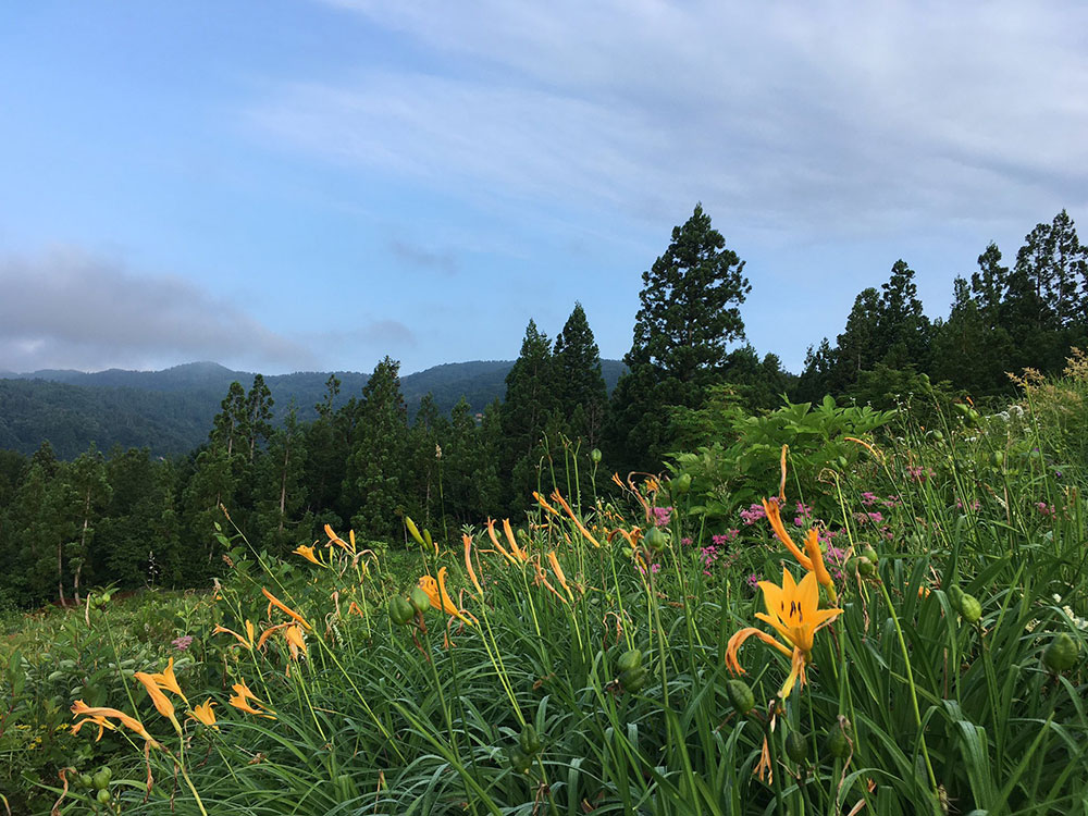 今朝は雲ひとつない青空です。ニッコウキスゲは八分咲きくらいに、ササユリも続々と開花しはじめました。