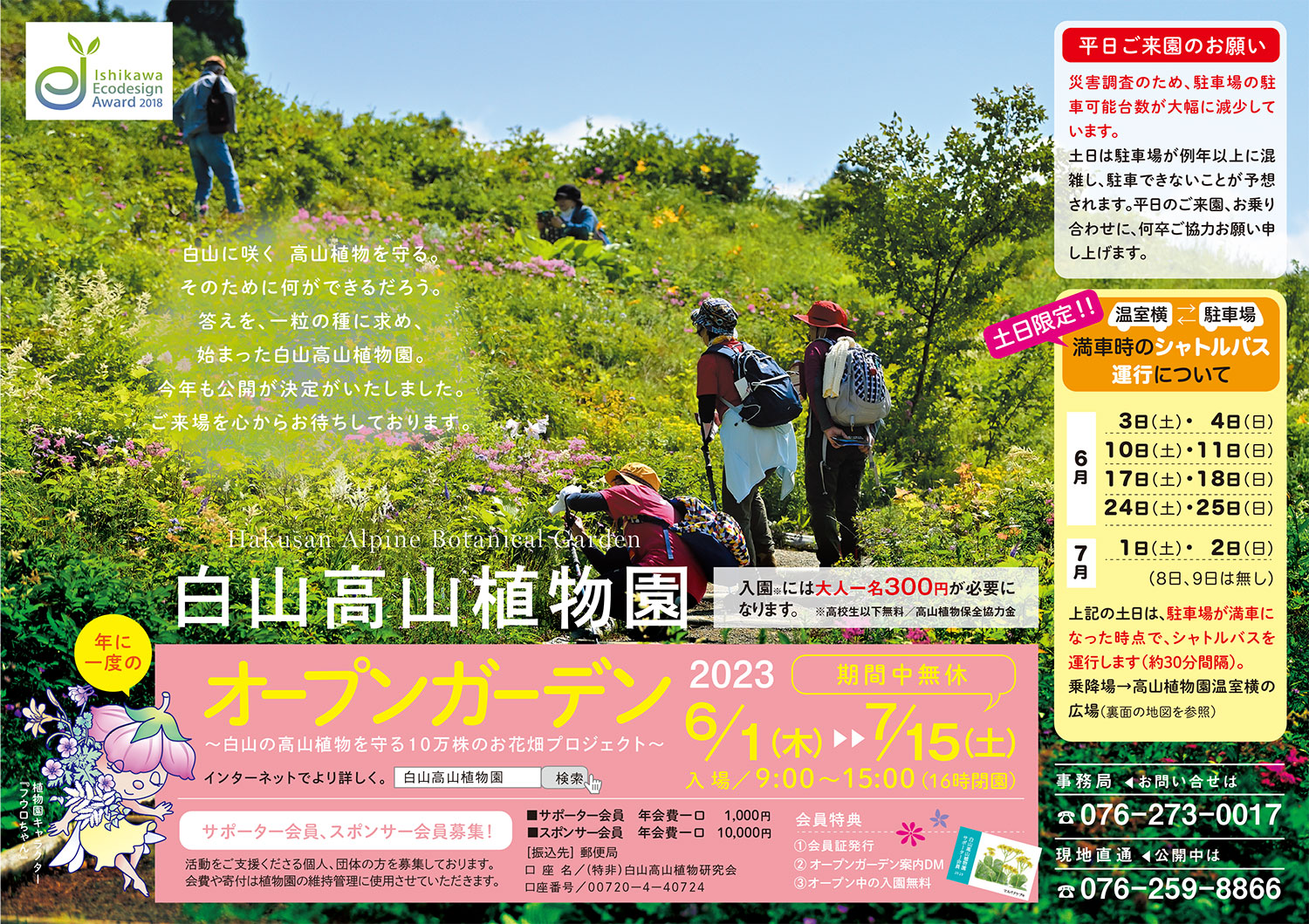 2023年度の白山高山植物園オープンガーデンを「6月1日(木)~7月15日(土)」の日程で開催いたします。新型コロナウイルス感染症が5類感染症へと移行され、3年以上にわたり行われてきた制限が解除されましたが、それに油断することなく、ご来園の皆さまのご協力をいただきながら、安全で安心できるオープンガーデンにしたいと思います。